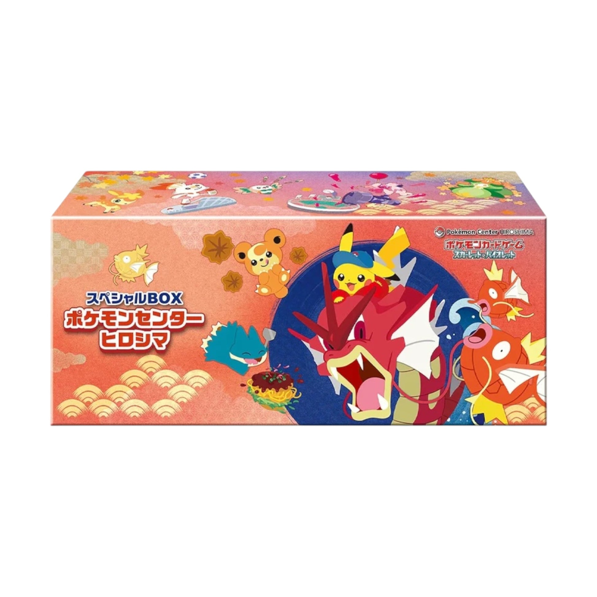 Celebrate the reopening of Pokémon Center Hiroshima with this beautifully themed Special BOX, released exclusively in Japan. This limited-edition set features a unique promo card of Pikachu riding a shiny Gyarados, surrounded by artwork inspired by Hiroshima’s culture and festivities.
